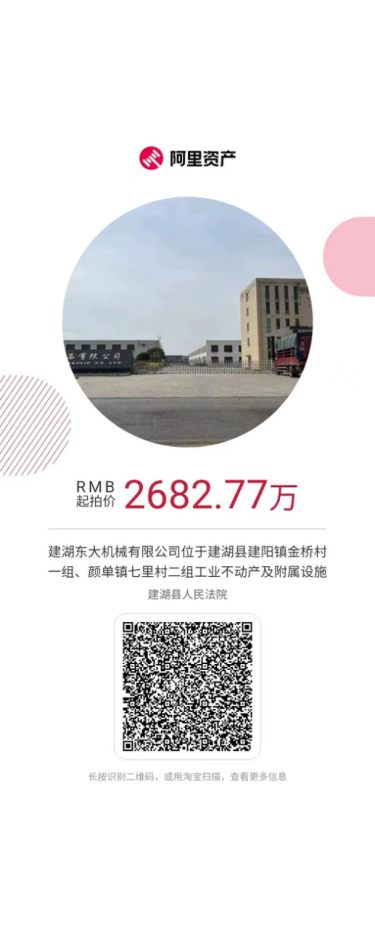 建湖东大机械有限公司名下的抵押物,位于建湖县县城建阳镇金桥村一组、颜单镇七里村二组,为工业土地及房产,房产面积23558.53㎡,土地面积63.72亩,厂房成新度较好,带行车,全部厂区作为抵押。厂区位于建湖高新区工业园区内,周边工业氛围较好,地理位置优越,距离建湖九龙口高速口直线距离5公里,交通便利。抵押物正在淘宝司法拍卖网挂拍。